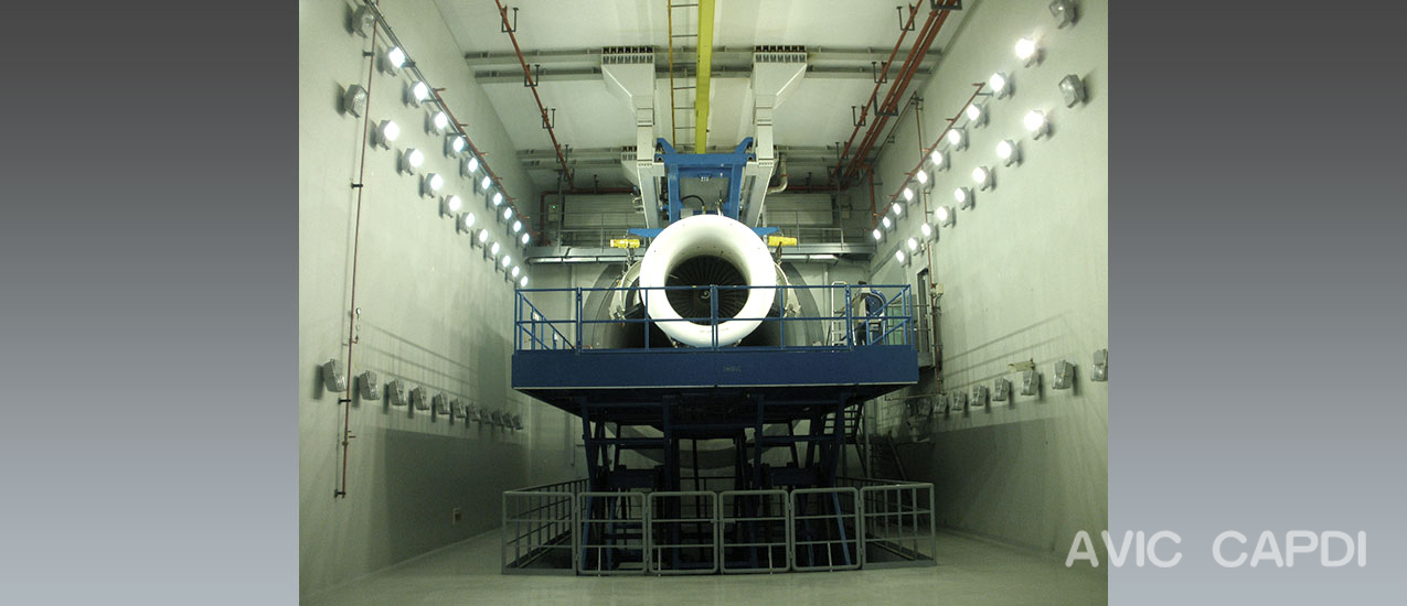 室內航空發動機地面試車臺,該試車臺為帶上部運輸的屋頂懸掛式試車臺,結構合理,發動機推力測量精度達國際水平。