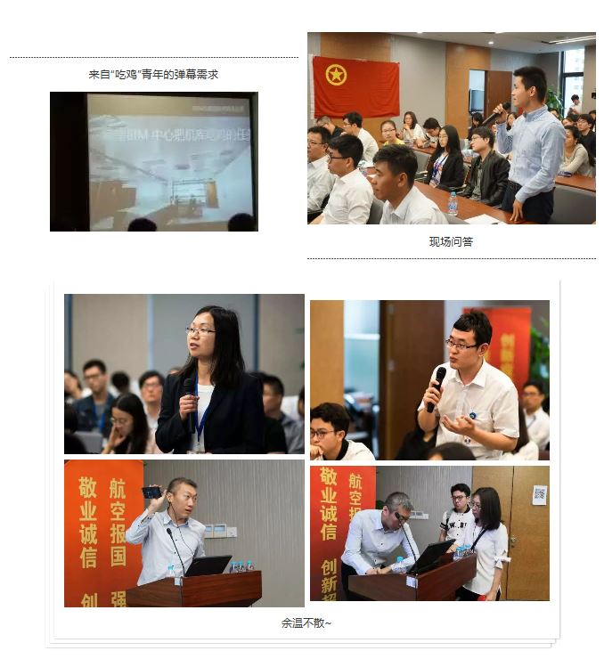 講座采用了多種信息化手段,實時的彈幕提問與持續不斷的現場問答將整個講座推向了高潮,“機庫吃雞”“BIM與區塊鏈”等互聯網熱點也成為青年員工關注的焦點,即便散場以后,大家的熱情依舊不減,圍繞在云朋身邊的“問題”青年不斷。