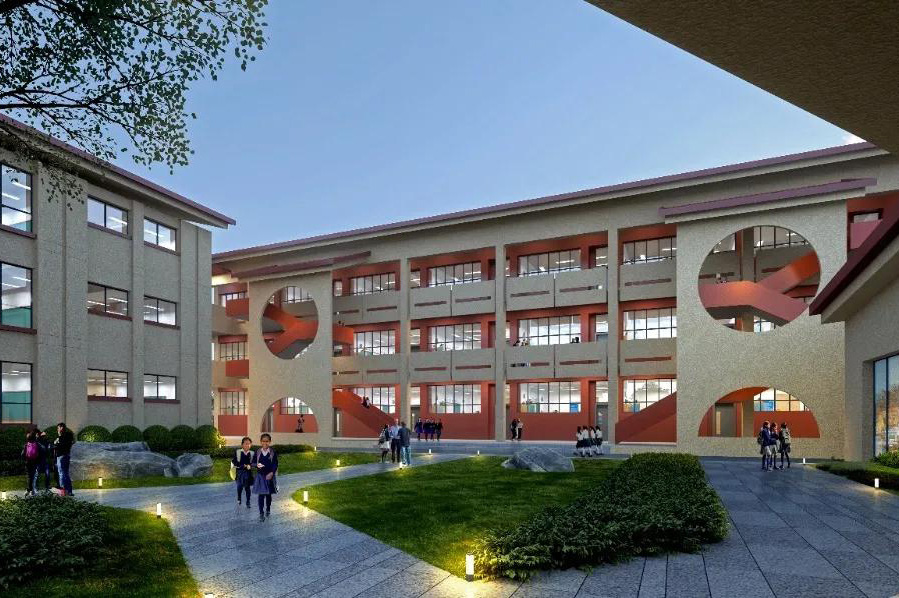 建筑立面設計汲取當地建筑特色,結合氣候條件設置坡頂、外廊等,打造一座符合當地氣候特點、融合當地建筑風格的綜合性中學。